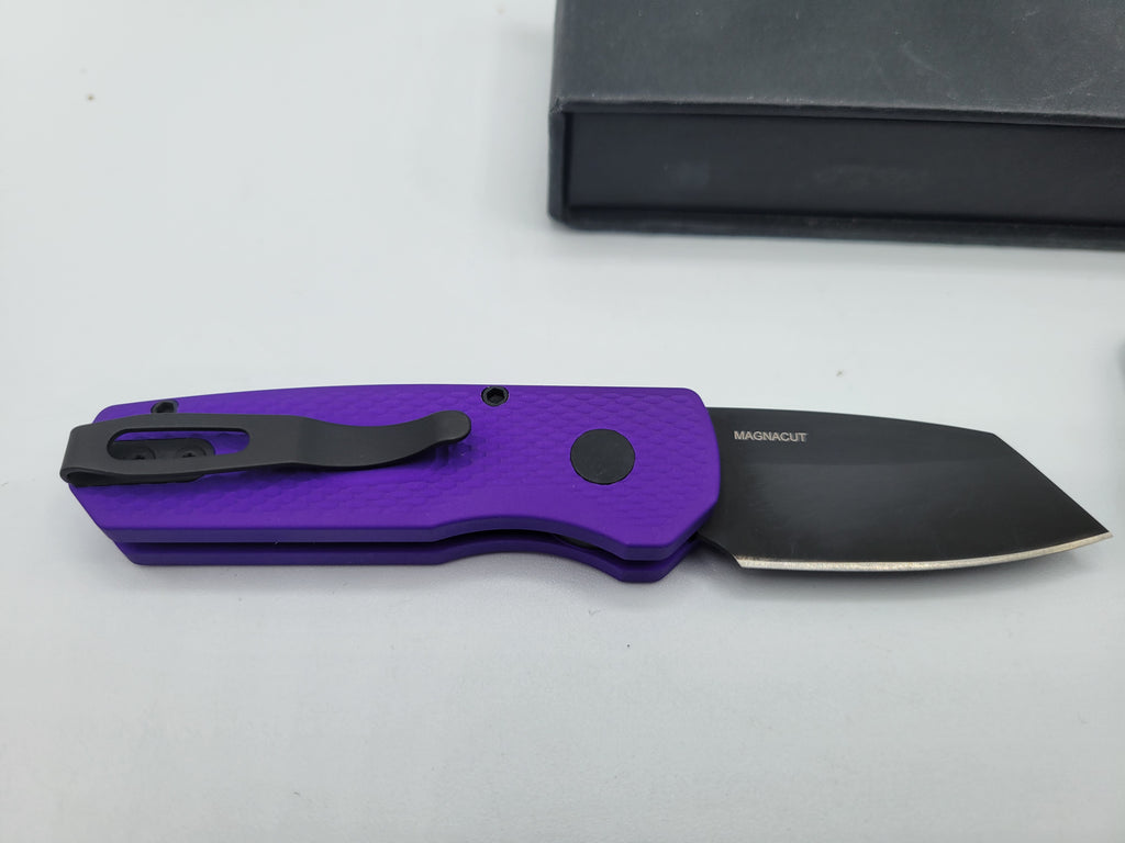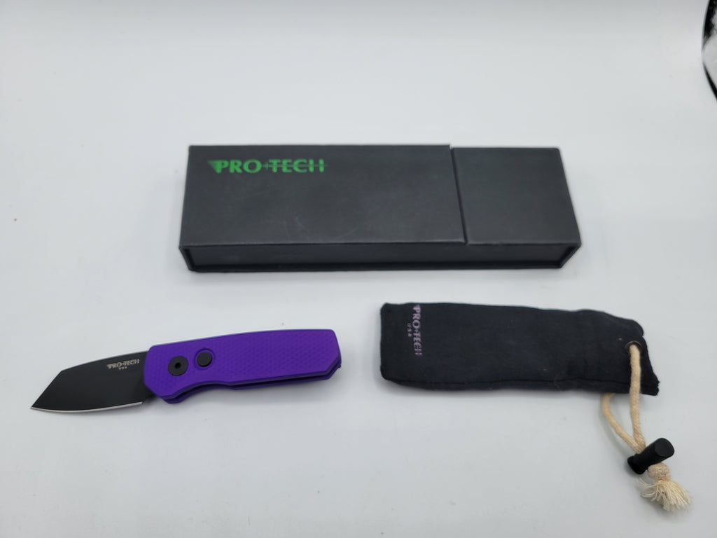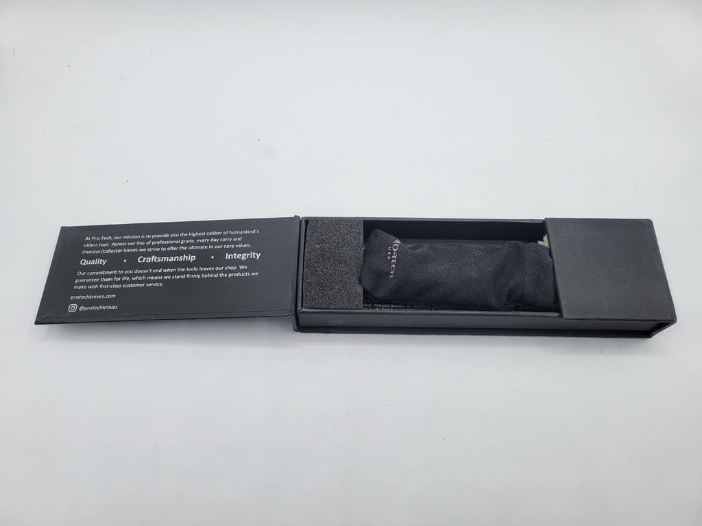 This is a Protech Runt 5 Automatic knife. It is previously owned, in excellent condition with no major signs of wear. Includes box and cloth case. Super strong opening spring - really snaps open with authority!